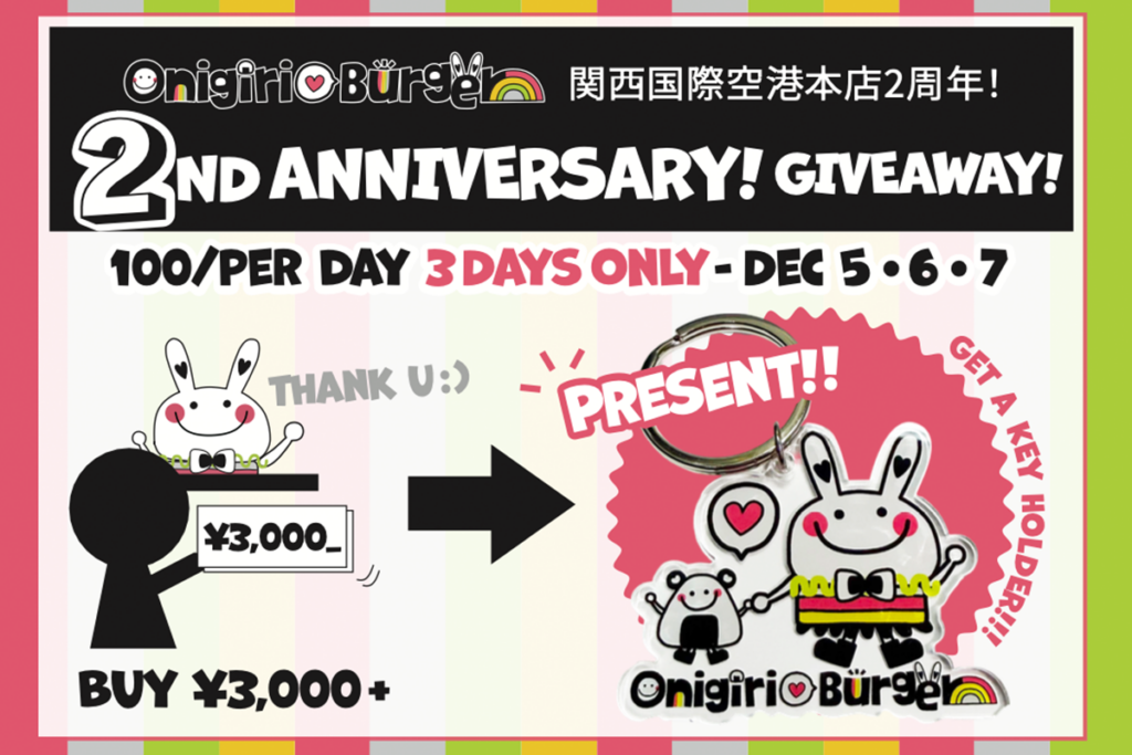 2025年12月5日(金)・6日(土)・7日(日)の3日間、『OnigiriBurger 関西国際空港本店』にて、2周年記念プレゼントキャンペーンを実施いたします。